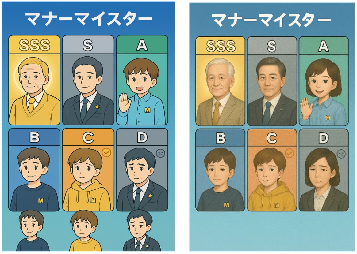 | SSS | 模範層(頂点) | 礼儀・配慮・誠実さが常に高水準。困難な場面でも冷静かつ思いやりの行動を取る | ・混雑時に譲る・助ける ・約束厳守 ・誰に対しても公平 | 信頼資本が極めて高く、指導者や模範として評価される |
